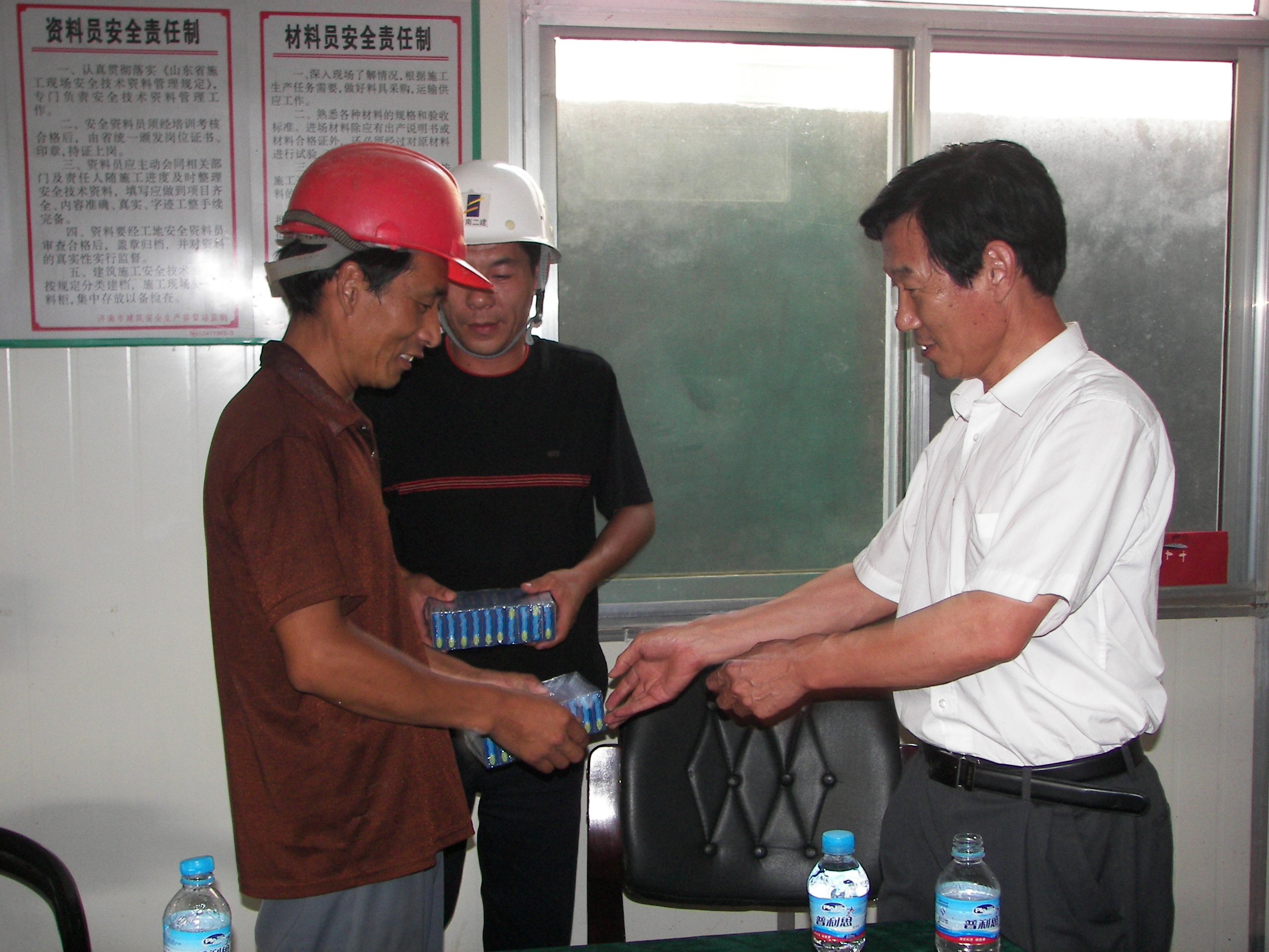 圖1:集團領導朱連仲副總在項目工地為民工代表發放撲克