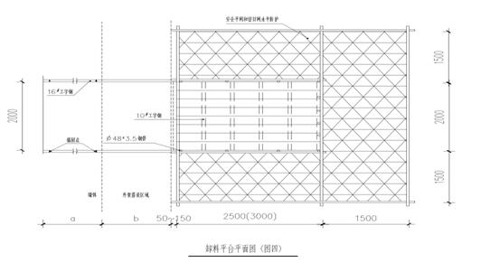 現(xiàn)行或在用的卸料平臺(tái)使用的是鋼筋焊接或短管焊接,費(fèi)時(shí)費(fèi)力,不方便使用,不方便運(yùn)輸。筆者建議:利用鋼管搭設(shè)更方便、更實(shí)用,長(zhǎng)短自選,用完后自行拆除。其做法是:利用前后兩根立桿,從其根部向外搭設(shè)通常橫桿(如圖四),再在外挑桿的端頭和靠近料臺(tái)邊處連接水平桿,安全網(wǎng)和密目網(wǎng)系在縱橫水平桿上即可。