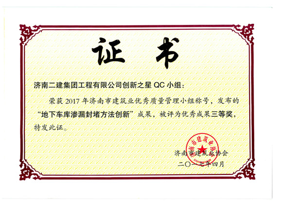 ??? 集團公司創(chuàng)新之星QC小組榮獲2017年濟南市建筑業(yè)優(yōu)秀質量管理小組稱號,發(fā)布的“地下車庫滲漏封堵方法創(chuàng)新”成果,被評為優(yōu)秀成果三等獎