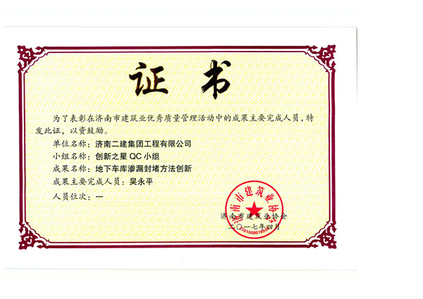 創(chuàng)新之星QC小組“地下車庫(kù)滲漏封堵方法創(chuàng)新”成果主要完成人員——吳永平